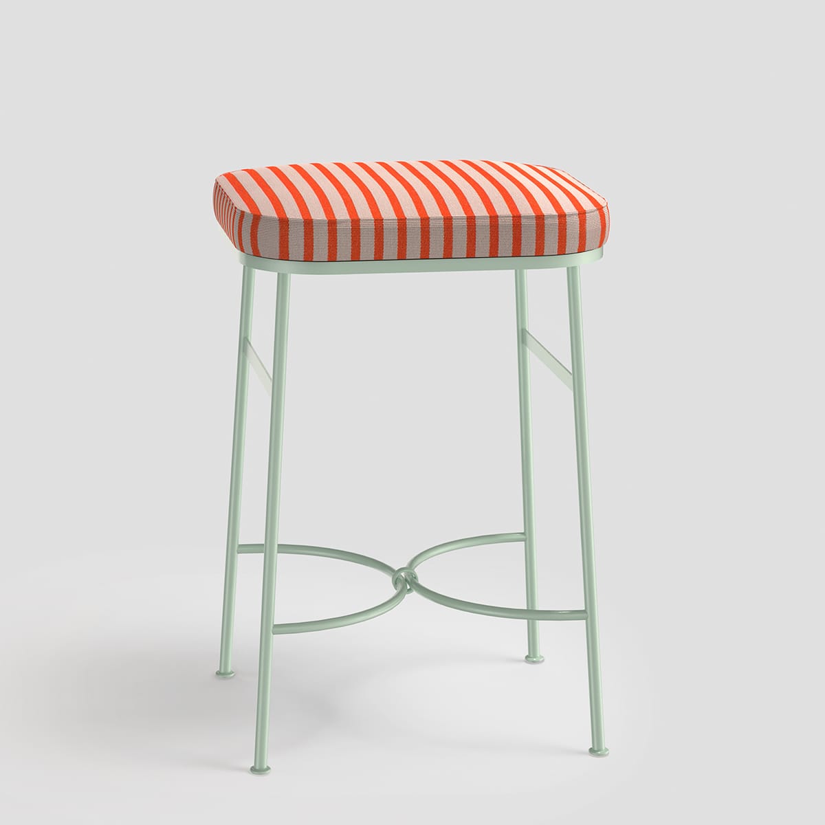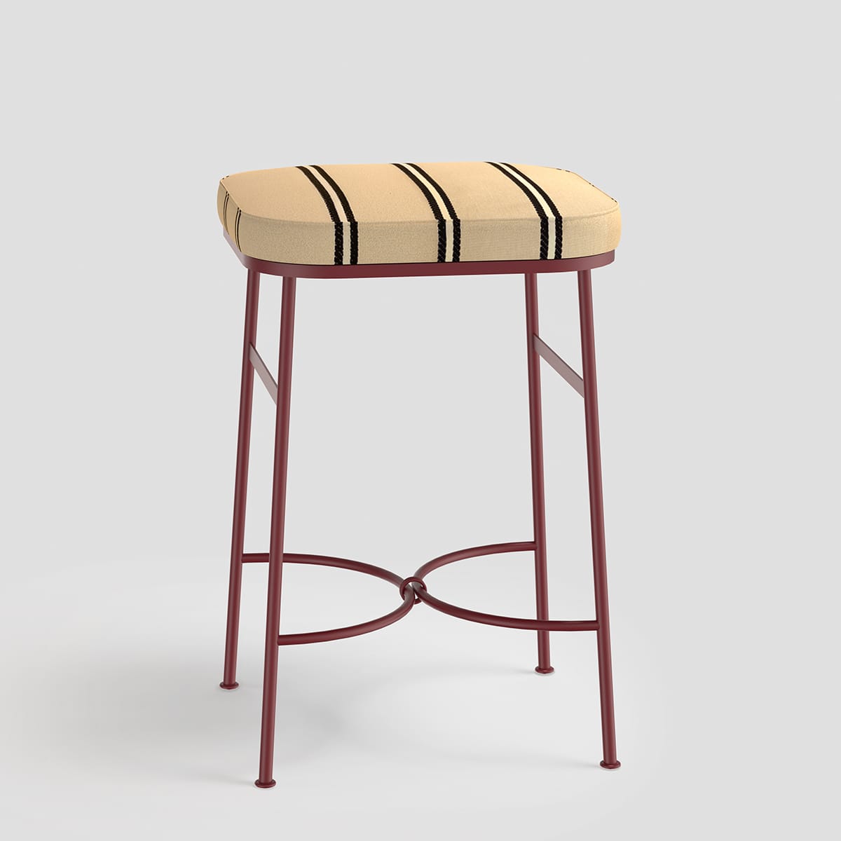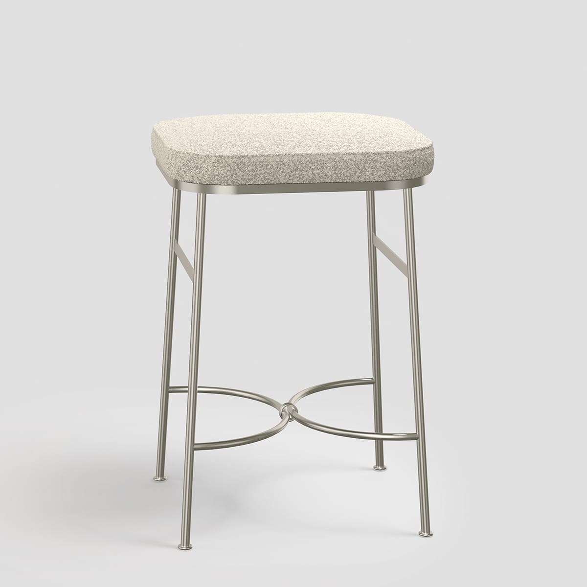 Linished stainless steel frame with a weighty and dimensional bouclé cushion by Mokum